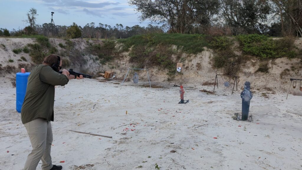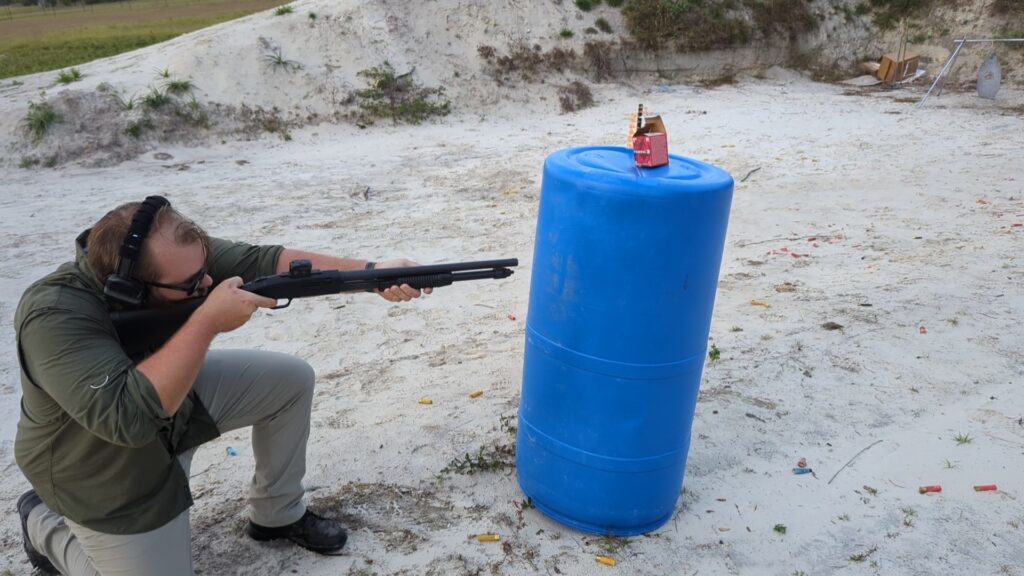 In practice, I could fire two shots from the low ready in less than a second on an A-zone at ten yards. I have that same speed with a semi-auto 12 gauge. For a pump gun, it’s quite fast. Without recoil and muzzle rise, it’s much easier to shoot the gun in less than stellar positions, like behind cover.