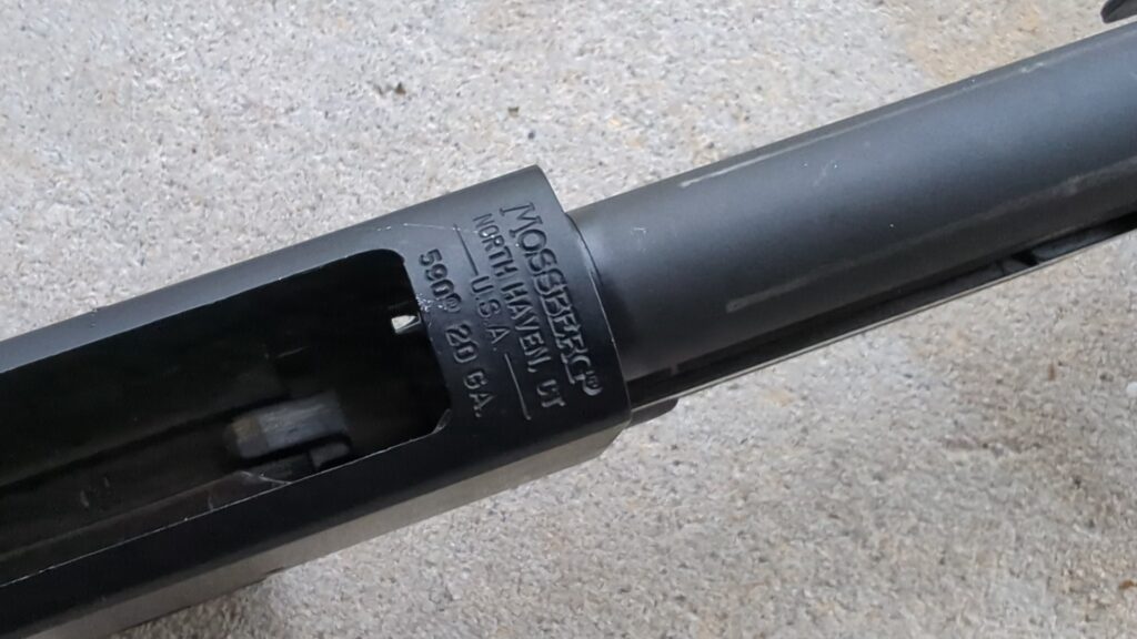 The model you’re looking at now is the seven-shot 20 gauge 590. They also produce a longer nine-shot model with ghost ring sights. This plain Jane version features an 18.5-inch barrel with a normal bead sight. It’s super plain and basic, but still a capable shotgun.