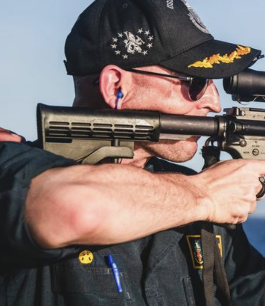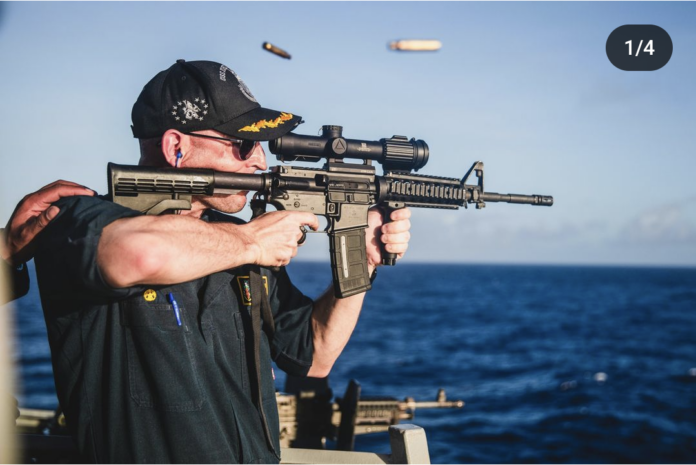 Why the delta ring is messed up is beyond me. The sailor firing the rifle has a set of scrambled eggs on his ball cap. This indicates he’s an O-5 or higher. It turns out he’s the ship’s commanding officer.