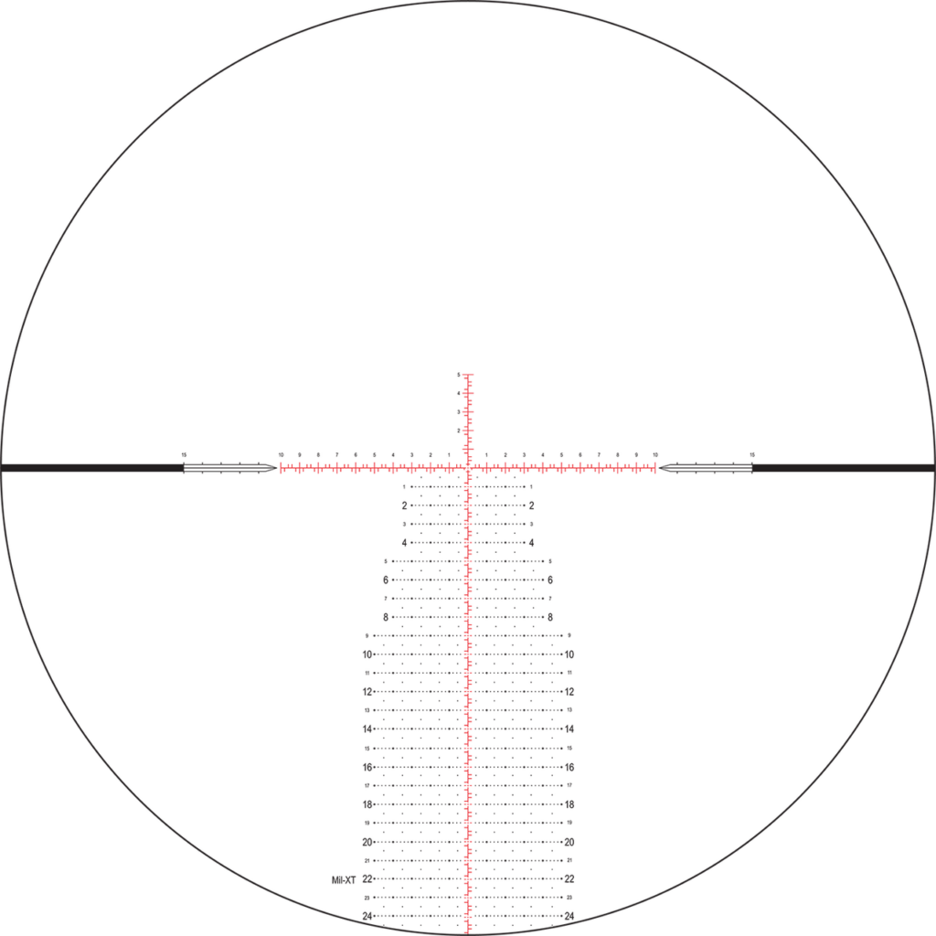 Every full mil hold line, whether vertical or horizontal, is clearly numbered with easy-to-see numbers. It’s one of my favorite details about the Mil-XT reticle, especially on the principal horizontal stadia line.