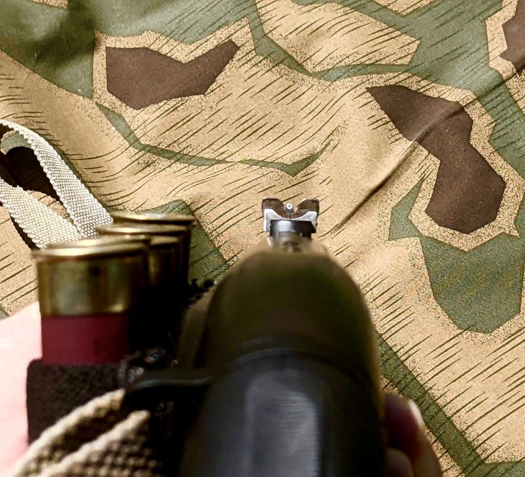 As currently configured, M’Bogo is a fourteen inch short barreled 12 gauge Remington 870 pump action shotgun. Its soul lies in its barrel—one that was fully done up by the gunsmiths at Vang Comp Systems. Not only was this barrel modified by cutting down a longer barrel to fourteen inches and given the internal treatment that Vang Comp is known for, but it also sports a very cool vent rib customization with an even cooler rear safari style sight module.