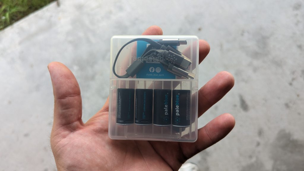The Pale Blue batteries are basic 3V batteries that can last at least 1,000 charges. They charge via a USB-A to USB-C charger, so it’s fairly quick, and the lot of them can be charged in about 100 minutes. These are lithium-ion batteries. They have a protection circuit to protect your battery and device so the battery will not overheat.