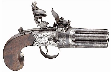 The pepperbox picked up speed in the late 1700s and rode the coattails of two-barrel turnover pistols. If two barrels is good, then even more barrel is better, right? Gun makes like Nock, famed designed of the massive volley musket, designed several rotating barrel pistols as did gunmakers in Belgium.
