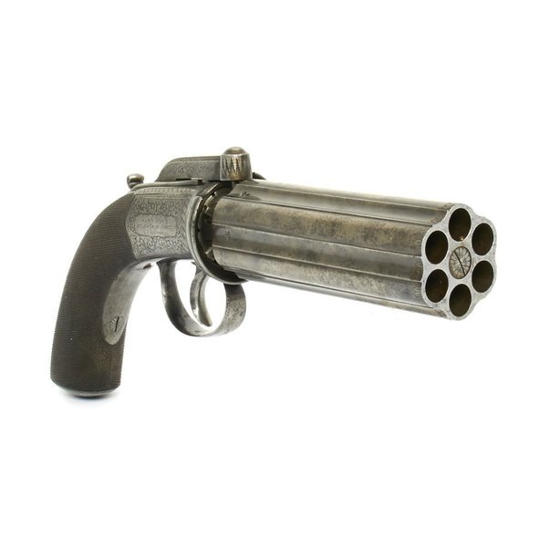 The pepperbox is a multi-barreled gun that’s similar to a revolver. It features multiple barrels that often rotate around a firing device, although that’s generalized. Several designs used fixed barrels with rotating firing pins, although rotating barrels are more common. They differ from revolvers in the fact that each barrel is also a cylinder. The name comes from the gun’s multi-barrel look that often looks like the top of a pepper shaker.