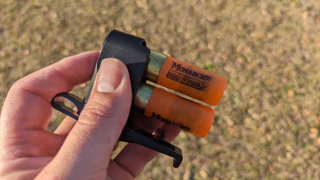 The spring-loaded design means it pops right back up when released, locking the remaining shell in place. This active retention device is an interesting take on the spare shotgun ammo holder. It’s super handy, easy to use, and designed to be very easy to reach and access. Shotguns aren’t high-volume weapons, and you won’t be laying down suppressive fire with one. In fact, I doubt most shotgun uses get to the point where the gun runs dry.