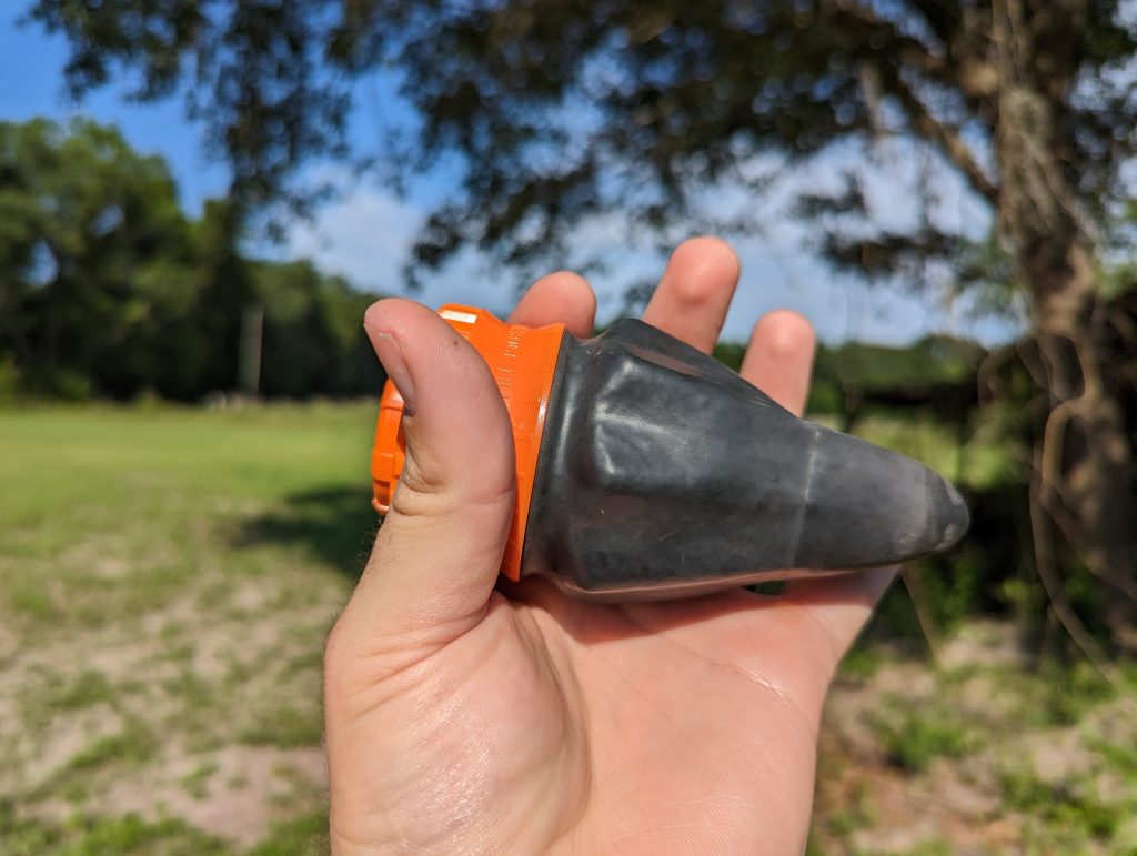 Ammo can be the official Pocket Shot ammo or your typical ball bearings. Personally, acorns and small rocks are the most cost-effective for me, and I let plenty of them fly. A front portion threads onto the Pocket Shot to secure the whole setup. This does allow you to carry extra ammo while it’s stored in the pocket.