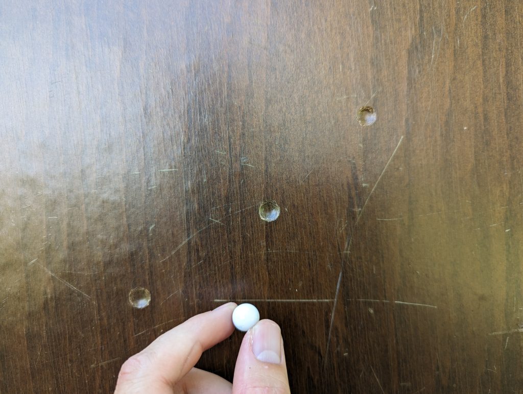 The Pocket Shot does launch those little balls fast and hard. I was chipping away at a cinder block with it. I also had an old dresser I needed to take to the dump that quickly became a target. In the tradition of mag dumping into trash, I threw some pellets at it. Those fast-moving balls left deep indents, and they are made from plastic. I don’t doubt I could kill the small game with this thing.
