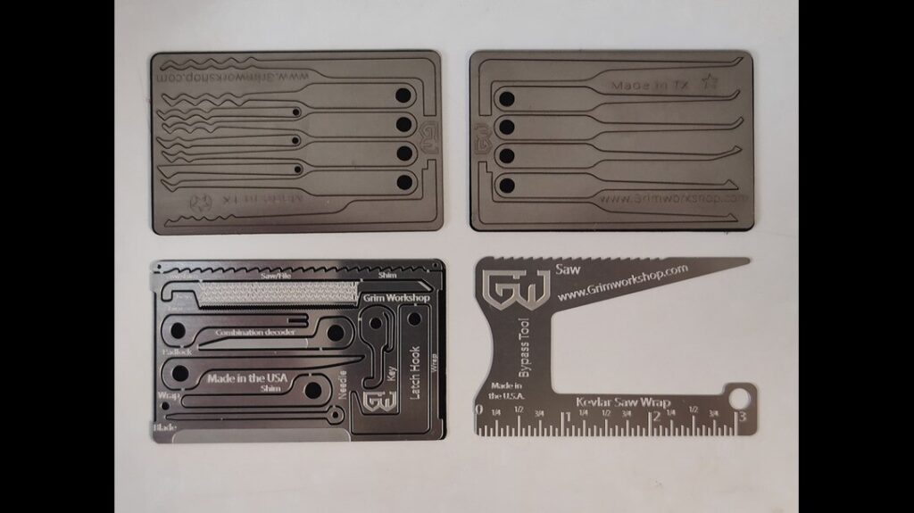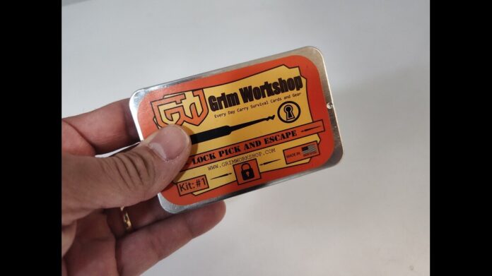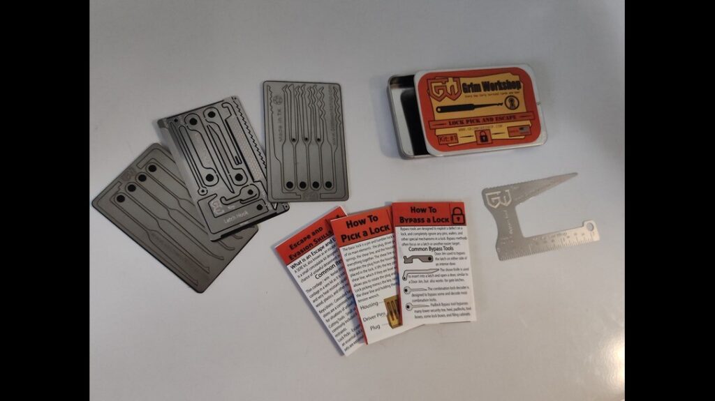 Inside the steel tin was a sealed packet of folded paperwork. The three individual packets were titled “How to Bypass a Lock”, “Escape and Evasion Skills”, and “How to Pick a Lock.” Four credit card-sized components were positioned underneath the paperwork. Two featured lock-picking tools. Grim Workshop’s designers shaped one component into a bypass tool and loaded the last one with mini escape gear.