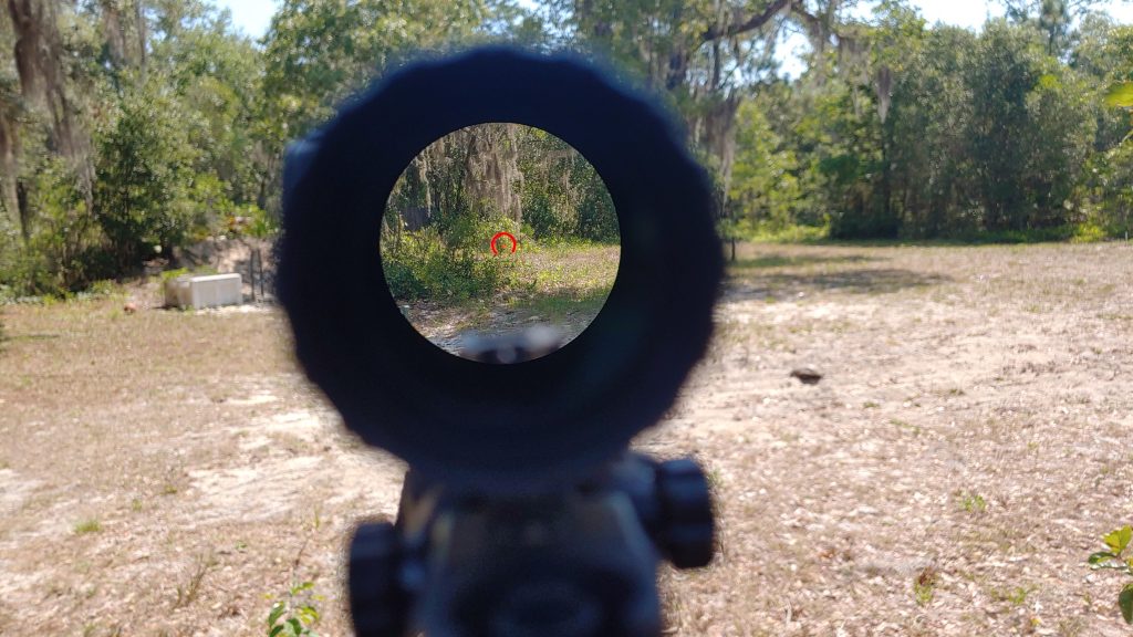 Primary Arms installed some seriously clear glass in the GLx. It’s brilliant, and I can see the colors of the various gongs and the shape and size well. The finely tuned chevron is glass etched and leaves plenty of room to see the targets.
