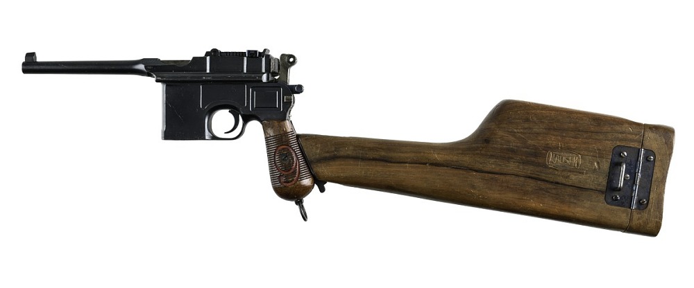 Pistol, semiautomatic, Mauser C96 ‘Red 9’. AF*37857. Shown with stock, AF*37857A.