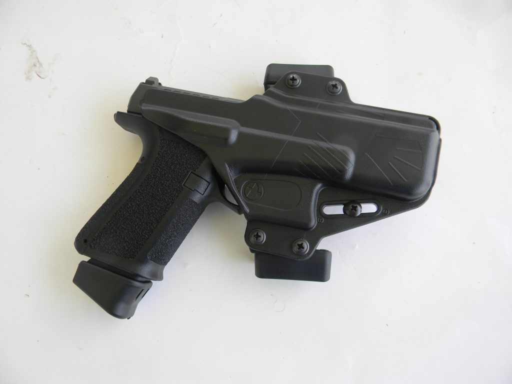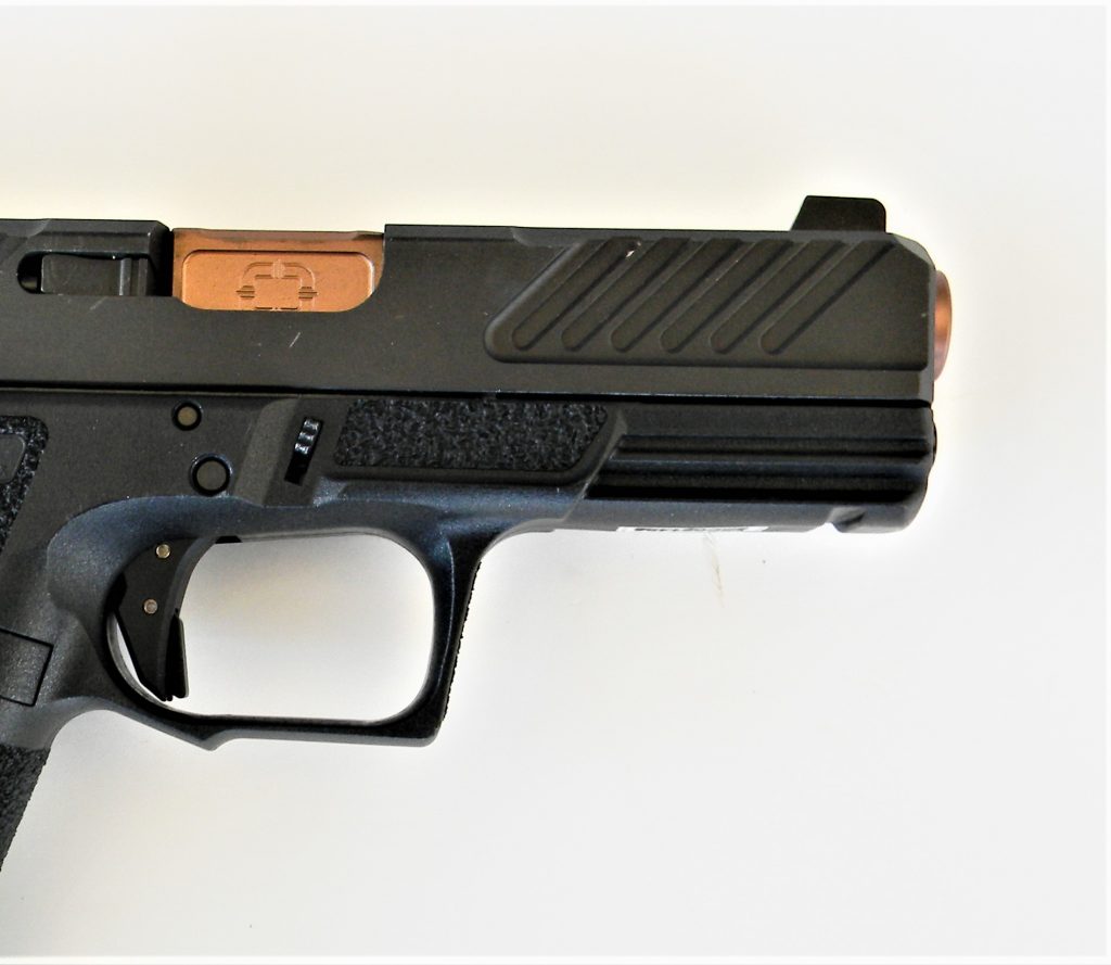 The Shadow Systems pistol features changeable grip inserts that differ considerably from the Glock including one that closely mimics the 1911 grip. The grip features an extended tang commonly referred to as a beavertail. The frame feels slightly different compared to the Glock. The trigger guard is undercut toward the rear to lower the bore axis. The grip frame treatment offers a balance of abrasion and adhesion. The slide features custom cuts and a nitride finish. The barrel features standard rifling rather than polygonal, so you may use lead bullet handloads. Shadow systems uses a Glock like trigger system superior in trigger press to the standard Glock. This is a factory trigger. No one may accuse the owner of reckless tampering. The pistol features a standard Glock type rail for mounting optics. A steel guide rod is added. The rear sights is a ledge type and the front sight is a bright tritium dot that offers excellent combat accuracy.