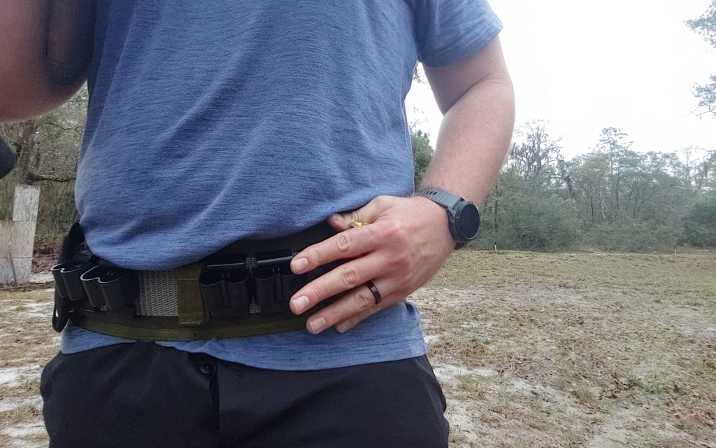 The shotgun belt reload uses bandoliers, the two-shot polymer Safariland belt mounts, and similar devices. 3-gunners know all about reloading from the belt and use specialized shell caddies. Those are great for 3-gun but offer poor retention for any kind of serious tactical application. The shotgun belt reload works with high-end bandolier belts like the Wilderness tactical belt and cheap bandoliers you can get from Walmart for five bucks.