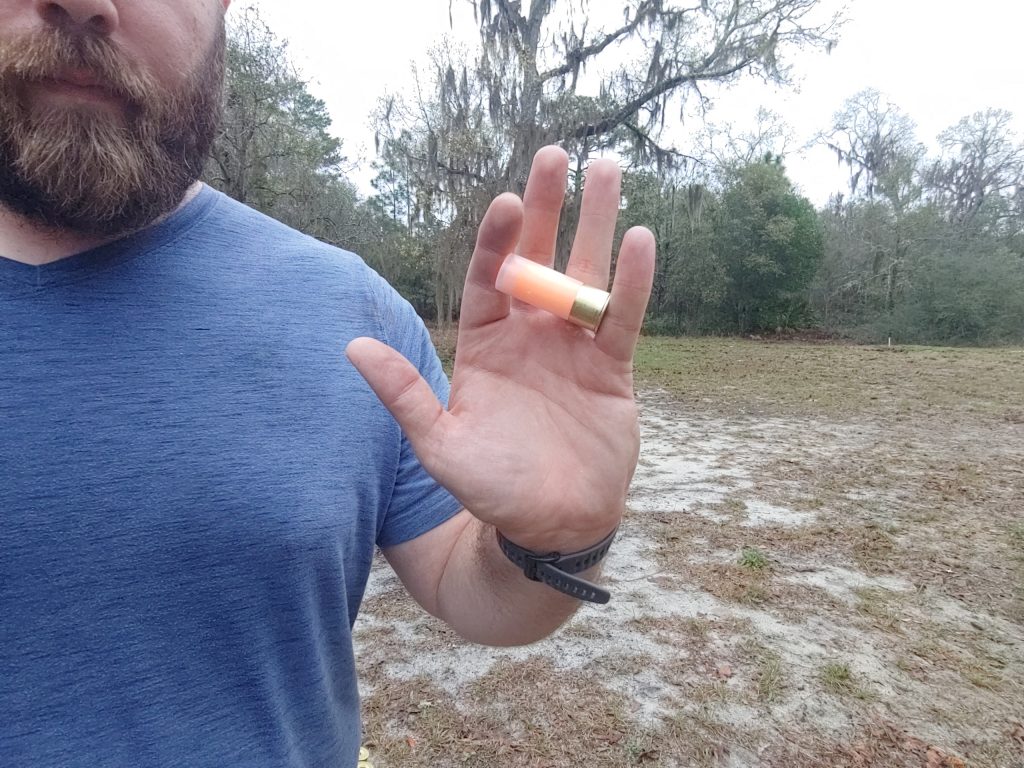 The trick to the shotgun belt reload is a good firm grip as you remove the shells from the belt. Once the retention gives, it’s like letting go of a tug of war rope mid-match. A loose grip might send a shell flying out of your hand. If this does occur, let the shell fly and load the other round still in your hand.