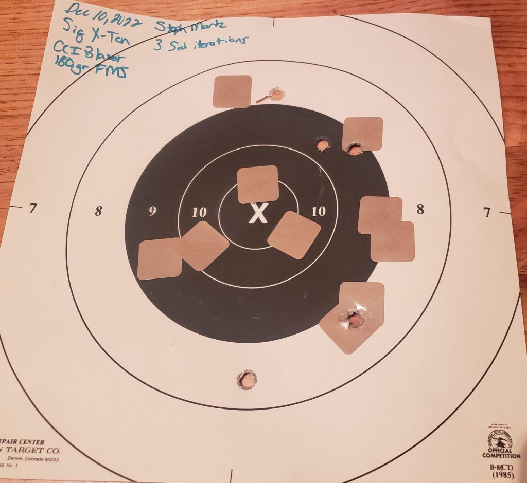 The SIG P320-XTEN is exactly what the name shows. A P320 in a different caliber. It has a polymer frame, reminds us of a normal 9mm firearm, and still eats the recoil of a 10mm up. Before I had my own XTEN I shot one at a stage at a match. The SIG guys working the stage stated that women have said that they didn’t know they were shooting 10mm until they were told. I believe it with how well I was able to shoot this 10mm right off the bat. To test just how well I could handle the recoil I shot some 25yd B8’s and shot some normal drills that anyone would shoot with 9mm.