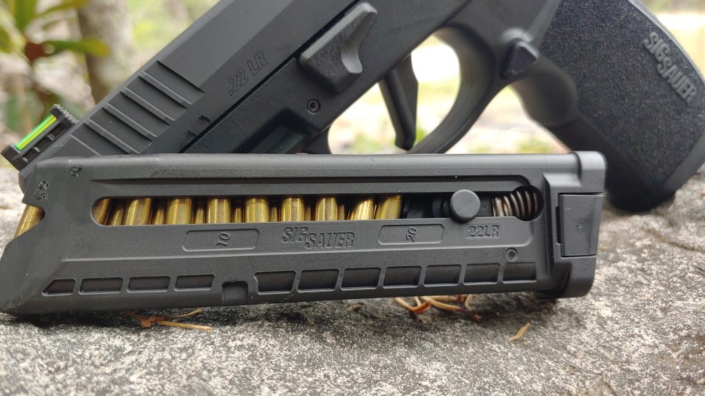 The biggest surprise, at least to me, was the magazine capacity. The gun uses flush-fitting magazines that pack 20 rounds of .22LR. That’s impressive in a genre of pistols dominated by ten-round magazines. You get two of them, and SIG is also producing a 25-round variant that’s slightly extended. To save your thumbs, SIG tossed a magazine loader in the box.
