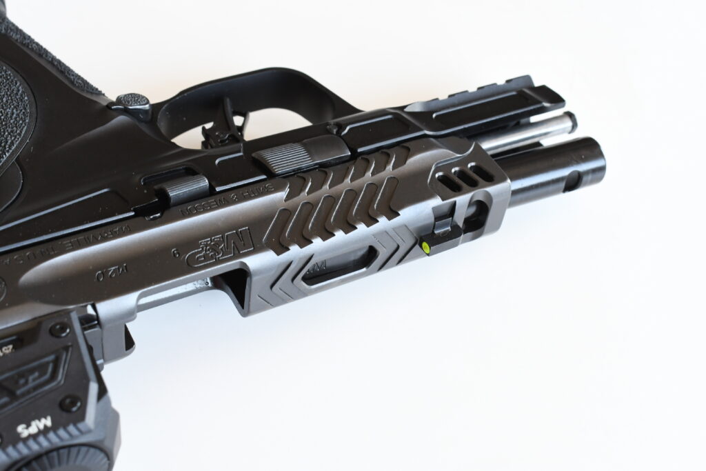 Compared to other aluminum-framed M&P 2.0s, the Performance Center Carry Comp series differs with a space-age aesthetic. Its slide is milled with a pattern of slide serrations that look completely different from standard M&P Metal models. They are more angled and curvier than the normal vertically slanted serrations.