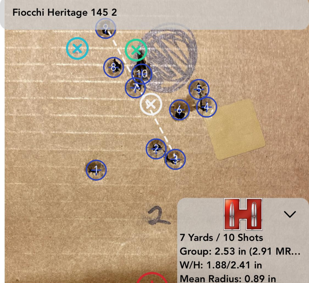 The three loads included the Fiocchi 145 grain coated lead round nose Cowboy Action Load, the Fiocchi 145 grain FMJ RN Heritage load and the Magtech 146 grain lead round nose cartridge. I shot 20 rounds each at two different 10-round groups and over the chronograph.
