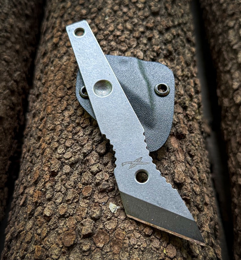 The Spark is a single piece of steel measuring 6.25 inches long and 1.25 inches across at its widest point. It weighs 6.0 ounces and comes with a formed Kydex sheath. There are several attachment points on the sheath. You can carry it on a lanyard as a neck knife or tie it to a pack strap or something similar so it is always close at hand.