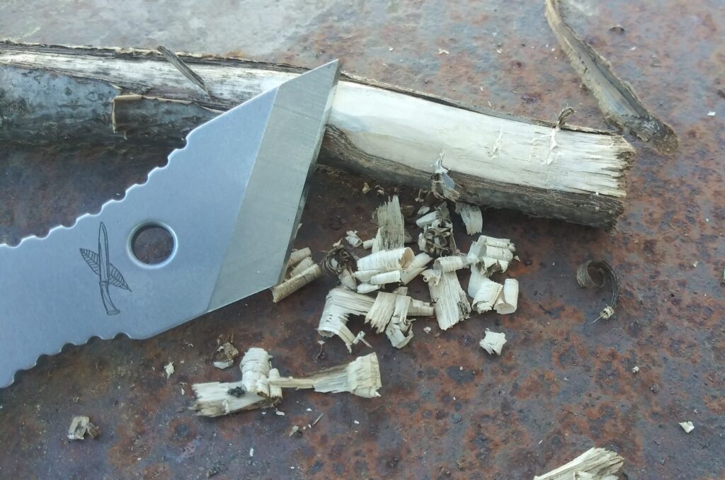 Like the kiridashi, the Spark has a chisel-edged blade. It’s strong and durable, and holds a sharp edge quite well. It works great for cutting cordage as well as shaving wood to create tinder. The edge is about 1.75 inches across.