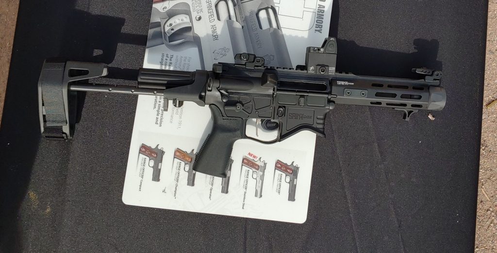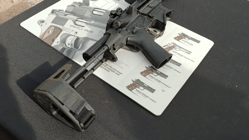 The PDW pistol brace is a Maxim Defense model and it’s largely accepted by the firearms community as the best PDW brace out there. The gun is also topped with actual sights. For some reason gun companies, these days seem to hate including sights onto their guns, but Springfield bucks the trend with spring-loaded, all-metal, flip-up iron sights on all of the Saint series rifles and pistols.