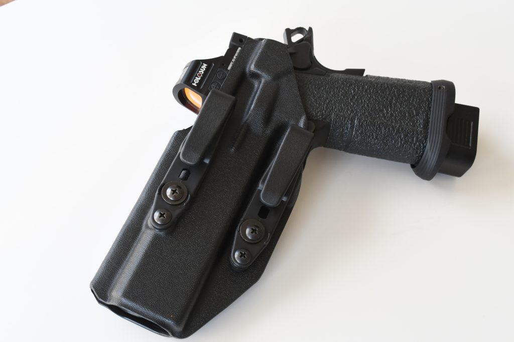 Classically built 2011 pistols, such as this one, were designed around a very wide double-stack magazine built for the competitive .38 Super cartridge. Even though the gun is chambered for 9mm, a lot of the internal dimensions exist with .38 Super blueprints. As a result, 2011s have some of the largest and widest pistol grips in the modern handgun world. Staccato-P owners who plan to conceal carry their pistols also need to be aware and make sure that this oversize grip does not cause printing issues.