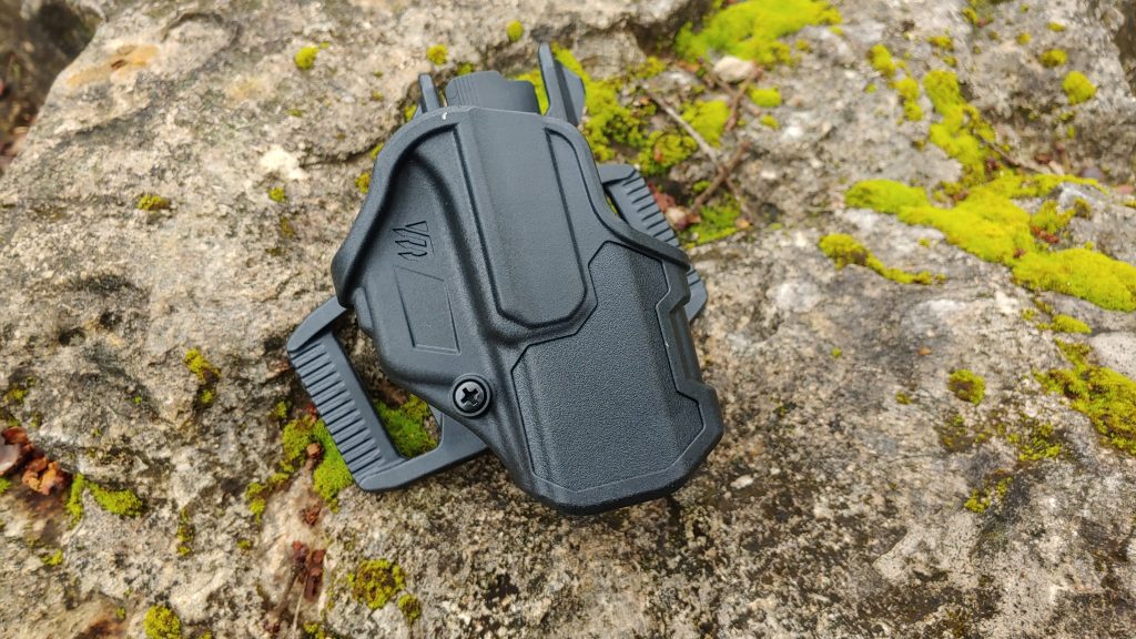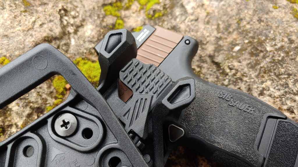 The retention device sits safely behind a pair of wings that protect it from your body when worn tight to the body. It’s a smart design that ensures the retention isn’t accidentally tripped when worn. The placement of the thumb-activated retention device is smart. When you establish a firing grip on your gun, your thumb naturally falls onto the device.