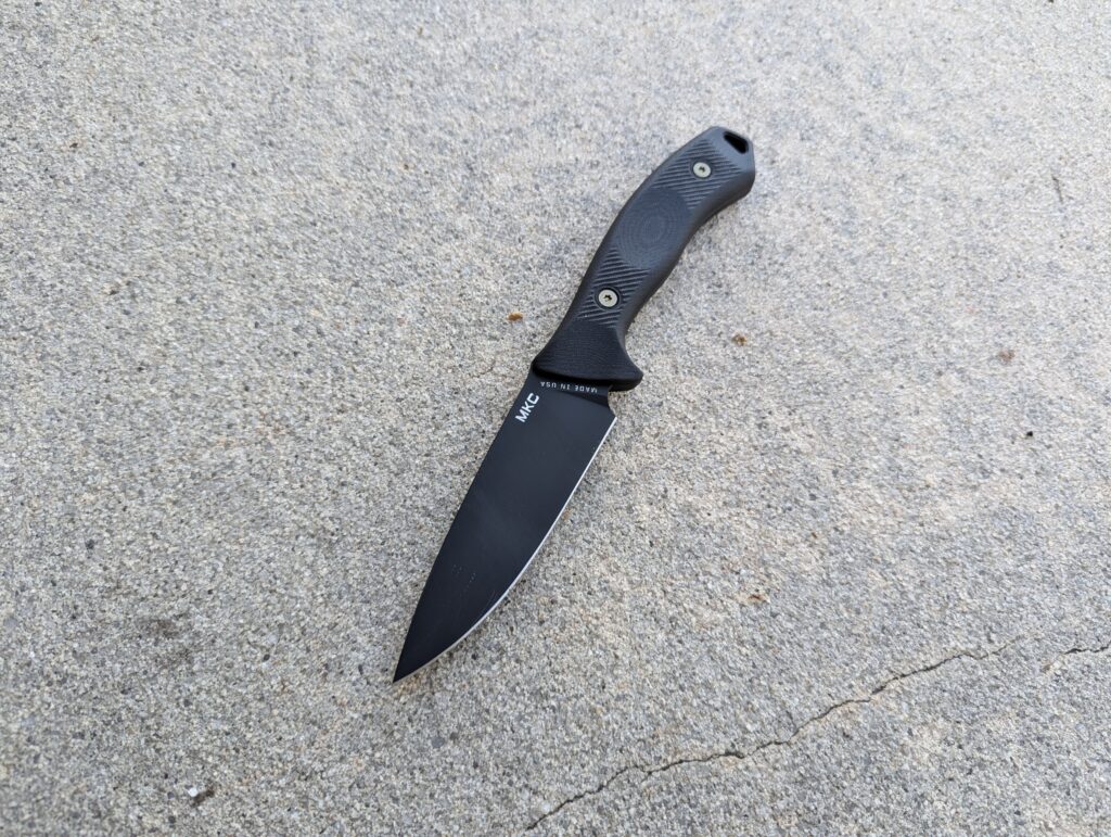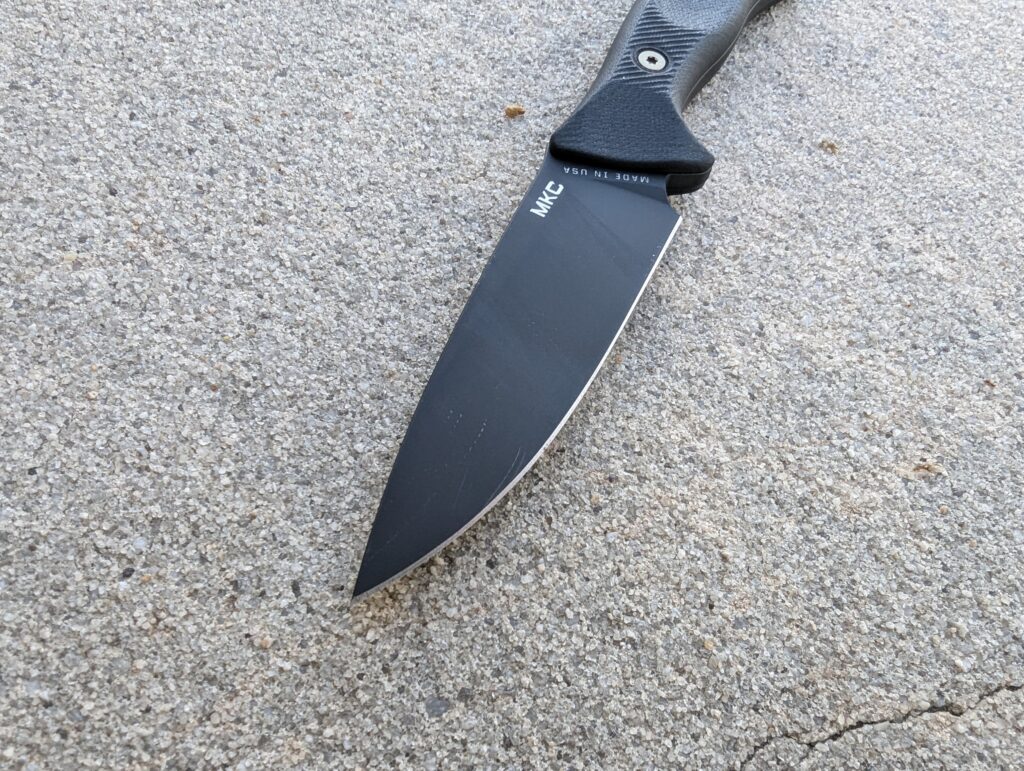 The blade on this knife is extremely sharp and well-made. It glides through whatever I put in front of it. The MKC TF24 will cut through rope, thin metal, paper, and meat—be it steak, chicken, or two-legged vermin. The blade has a drop point, which is one of the most versatile options for a knife.