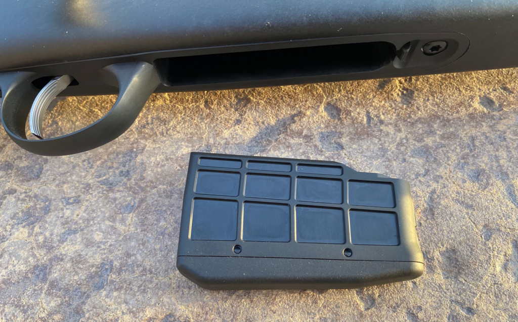 The entire pistol-grip area is designed as an interchangeable module and held in place by a screw. It allows end users to swap it out for different units to change the feel of the rifle. For example, one could add a pistol grip with a more vertical angle that’s similar to those found on precision-style stocks.