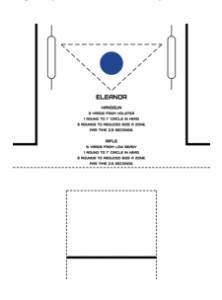 The target is free and can be printed from Sage Dynamic’s website. The Eleanor drill is fired from 3 yards for a handgun and 5 yards with a rifle. It requires you to place one well-aimed shot to a 1-inch dot from the draw with a handgun and from the low ready with a rifle, and then three rapid-fire shots to a reduced size A zone.