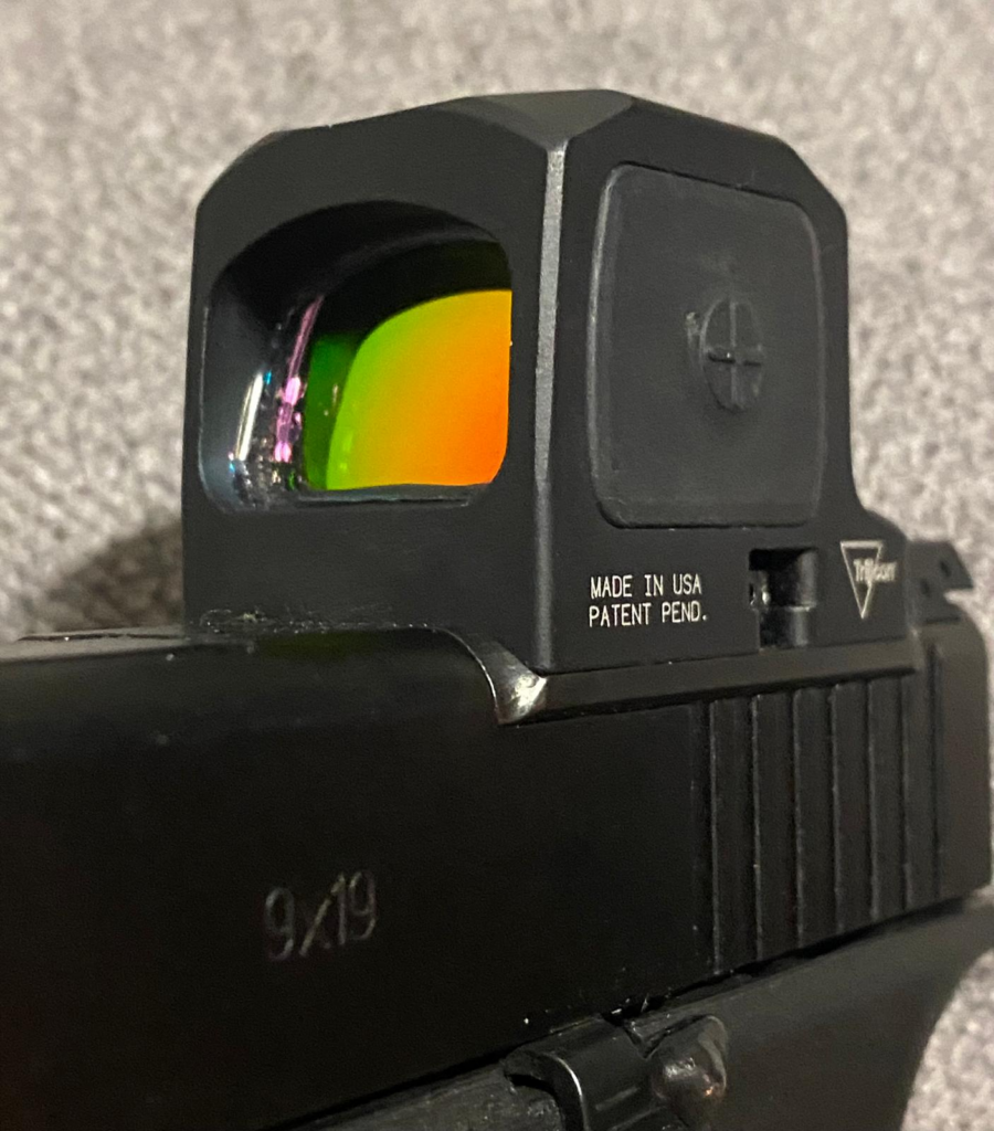 Some gentle distortion is also noticeable when looking through the objective lens, but nothing that has hindered shooting. While both the RCR and the RMR share many characteristics, the RCR’s objective lens is slightly smaller and subtly different than the RMR’s lens. No doubt some of this shrinking comes from adapting it to its fully enclosed housing. I find that its objective lens is very similar in dimensions to the objective lens of the Holosun EPS Carry sight.