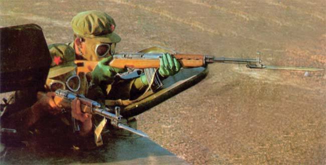 At this period, they were wielding the Type 56 assault rifle, which was an AK clone. They also had the Type 56 Carbine, which was an SKS clone. Up until the late 1950s, the Chinese and Soviets were buddies and shared weaponry and technology. In the late 1950s, there was an ideological split, and the Soviets were too keen on sharing tech and experience.