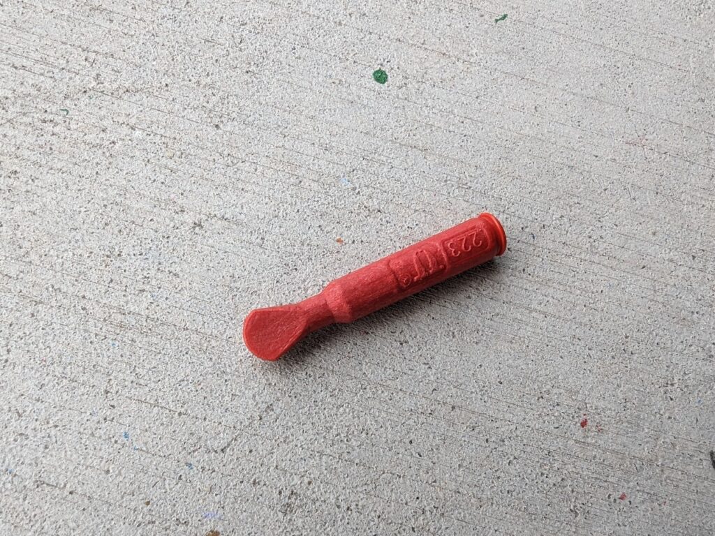 Live Fire Tactical Training makes these devices from a pretty simple polymer material. They are bright red and instantly identifiable as dummy rounds. The body of the Type3MalfunctionRound looks like a dummy round, but when you get to the head of the cartridge, it turns into a spoon-like shape. This is where you get your serious malfunction from. It can’t be chambered and creates the malfunction. It’s ridiculously simple, and I can’t believe no one had thought of it before.