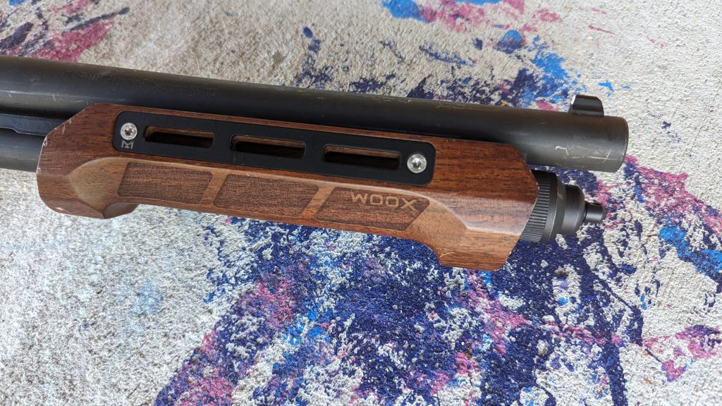 The Gladiatore furniture from Woox is wood, but Woox famously modernizes wood furniture. With the Gladiatore forend, we get a big wood shotgun pump that’s also outfitted with metal-reinforced M-LOK slots. Three M-LOK slots sit on each side of the pump, which allows for the attachment of lights and lasers as you see fit. Primarily lights, but hey, lasers and hip-firing these guns are pretty fun.