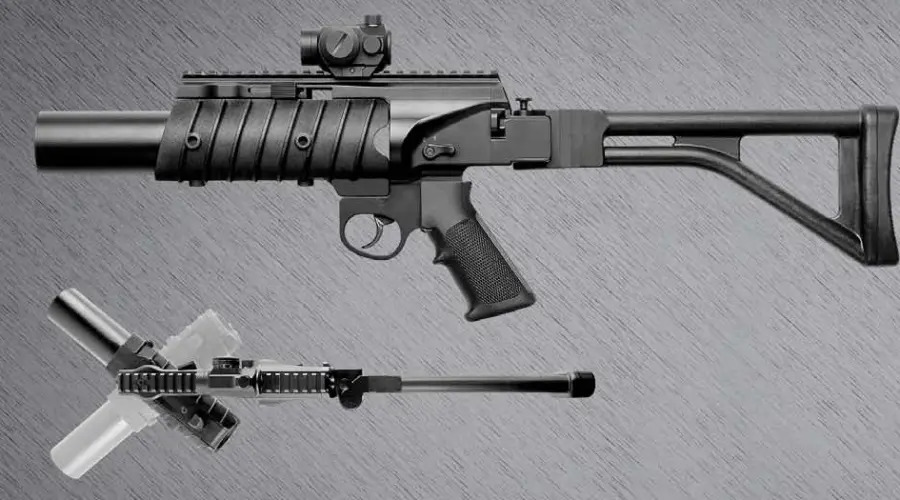 Taurus makes both a 38mm less lethal and a 40mm grenade launcher for Taurus military customers. The LT40 has a fascinating and fairly creative design. It can be attached to a rifle or used as a standalone platform. The standalone platform features a folding stock, an AR-15-style grip, and an optics rail. This single-shot design can pivot to the left or right to open the breech for loading grenades.