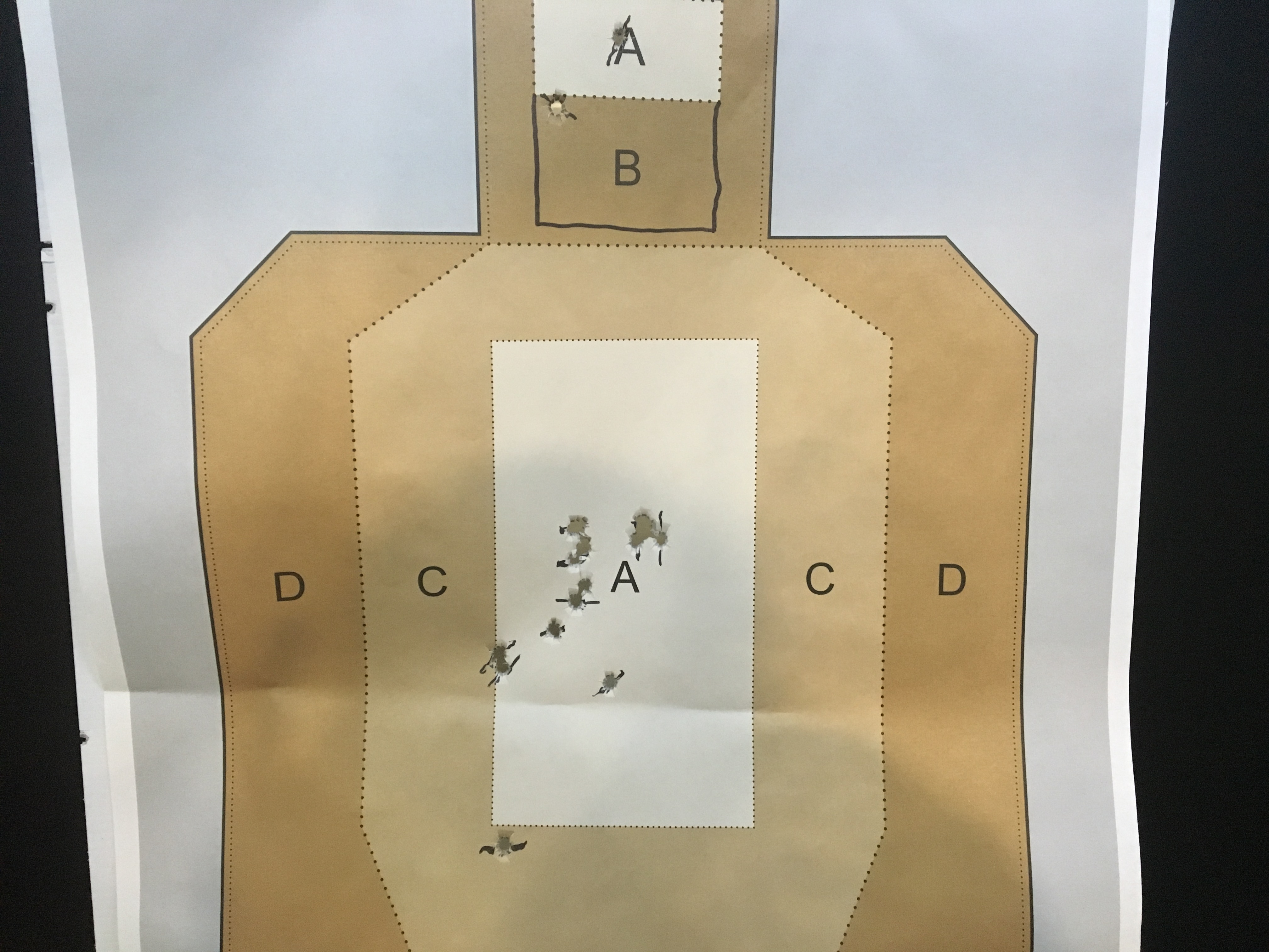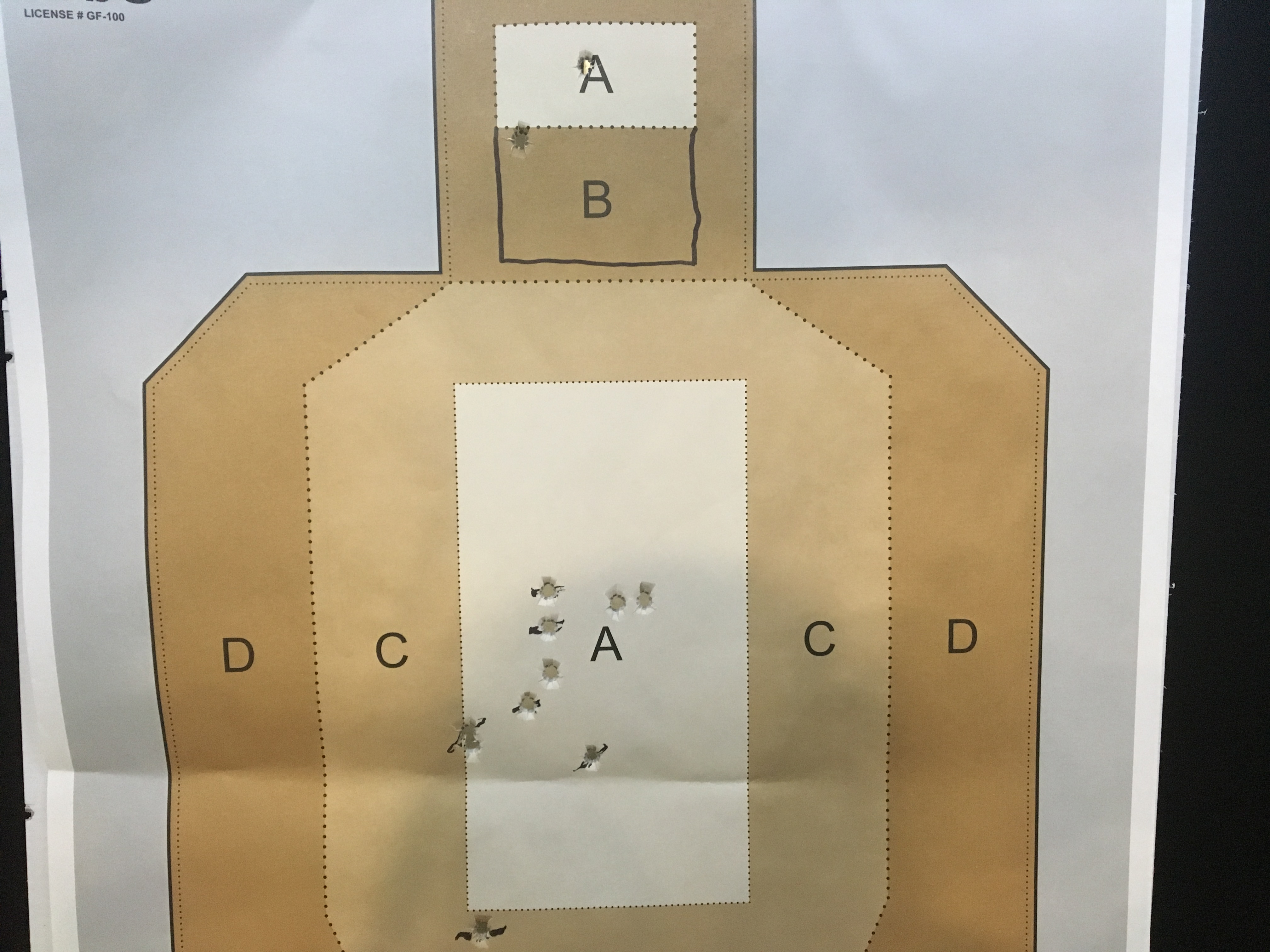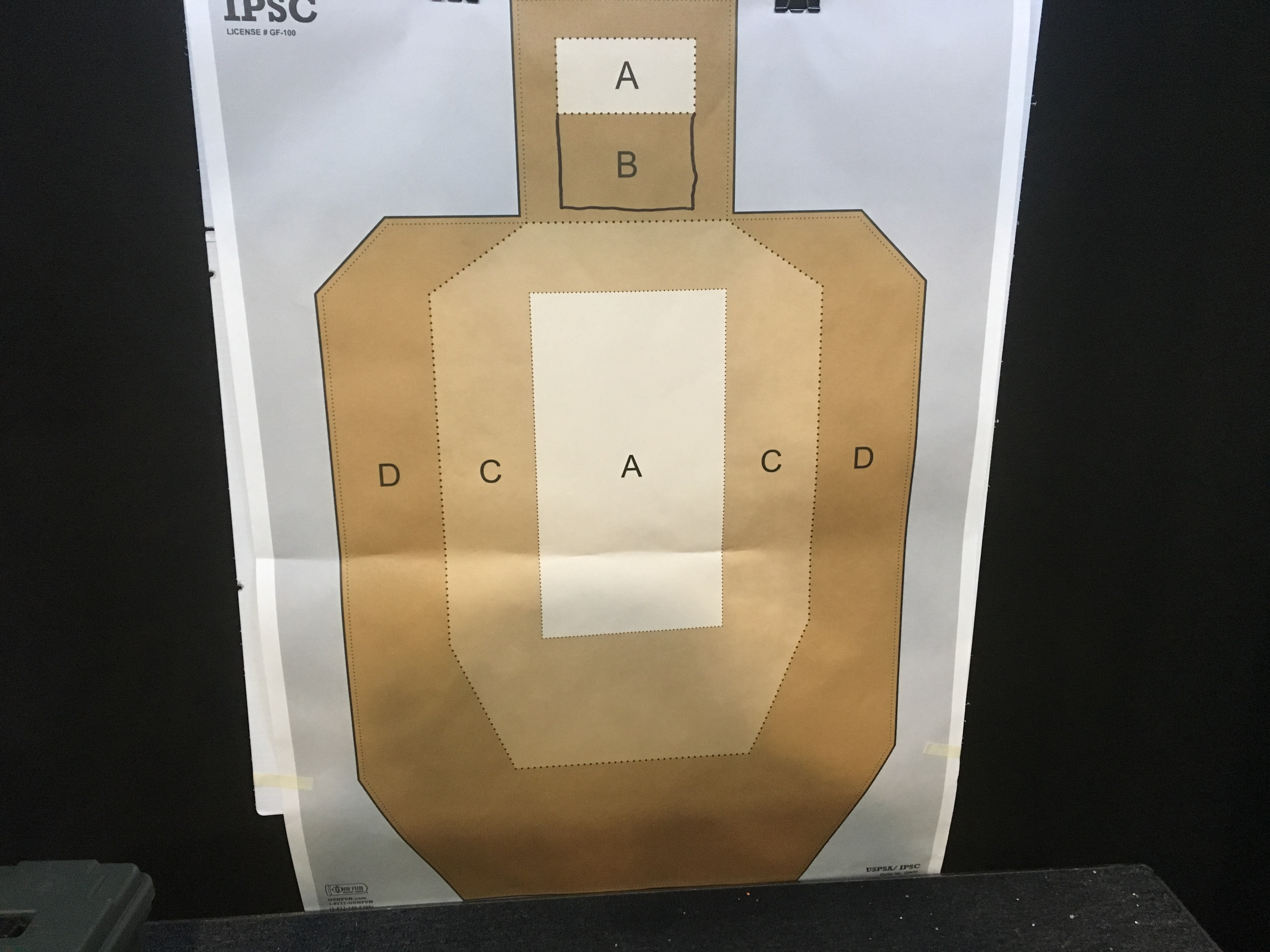 I used an IPSC Silhouette and an adjusted head box to score. The Box would be 10, outside the box would be 4 to match the CPP metric. On the body A would be 10. Within an inch of A bottom, left, or right would be 8. The remainder of C outside that inch would be 6. D would score 4. The timer application I used was IA’s Shot Timer. The app could not consistently pick up shots indoors but the par time function was all I needed.
