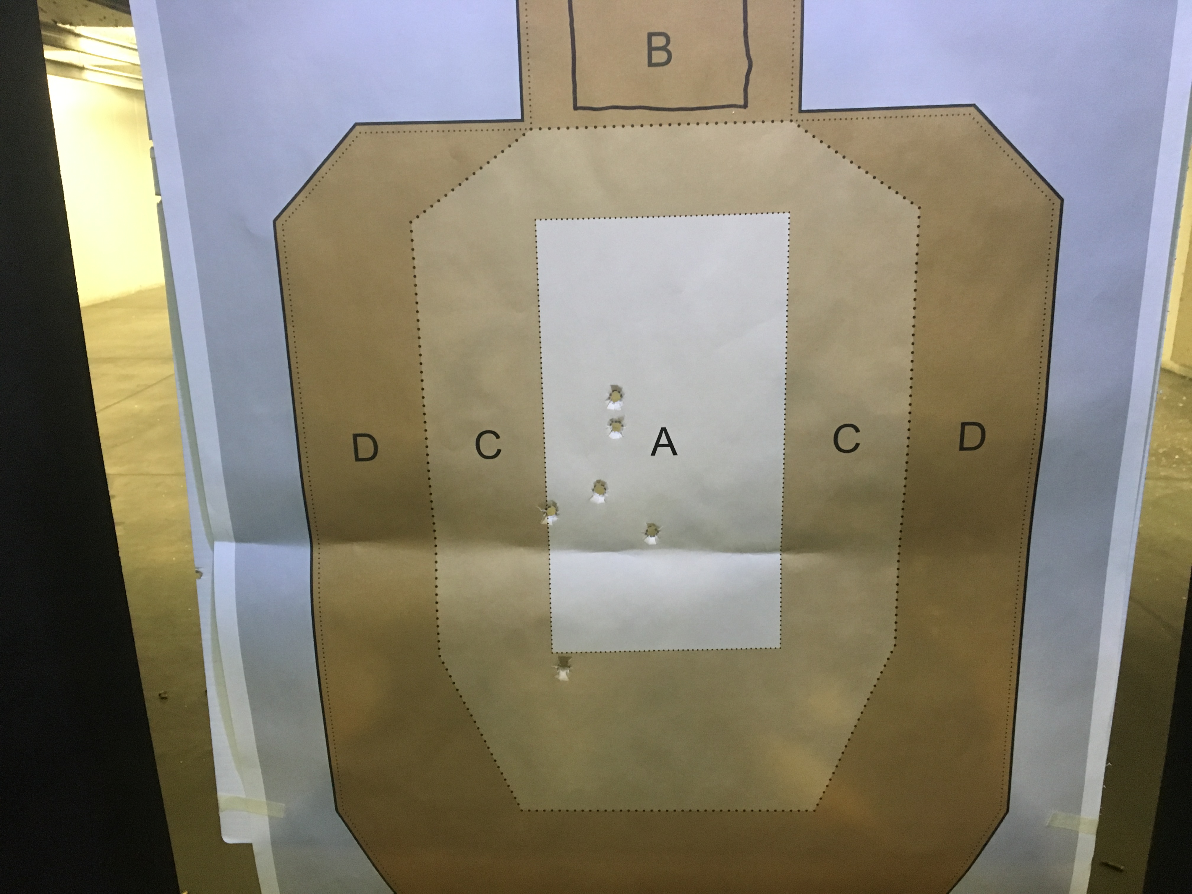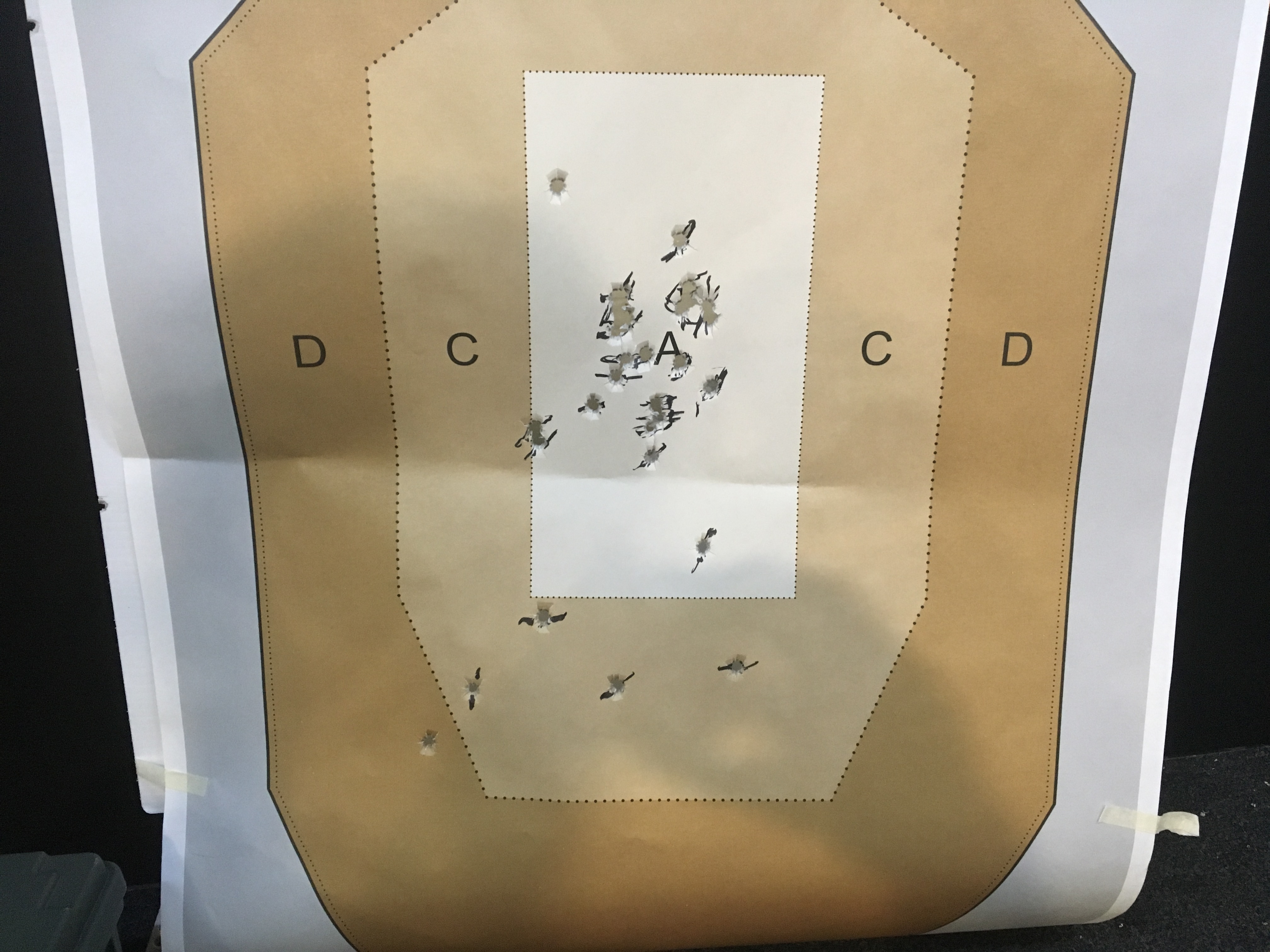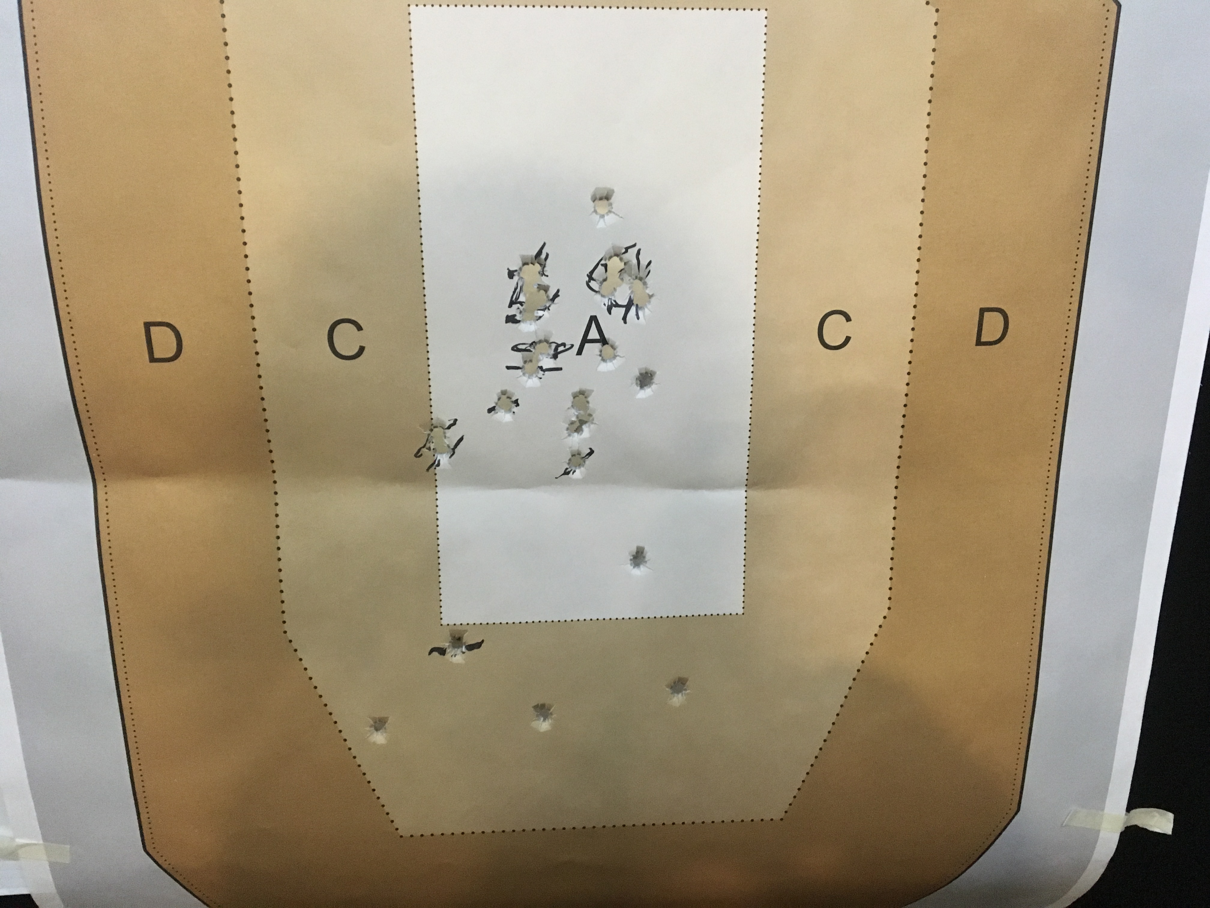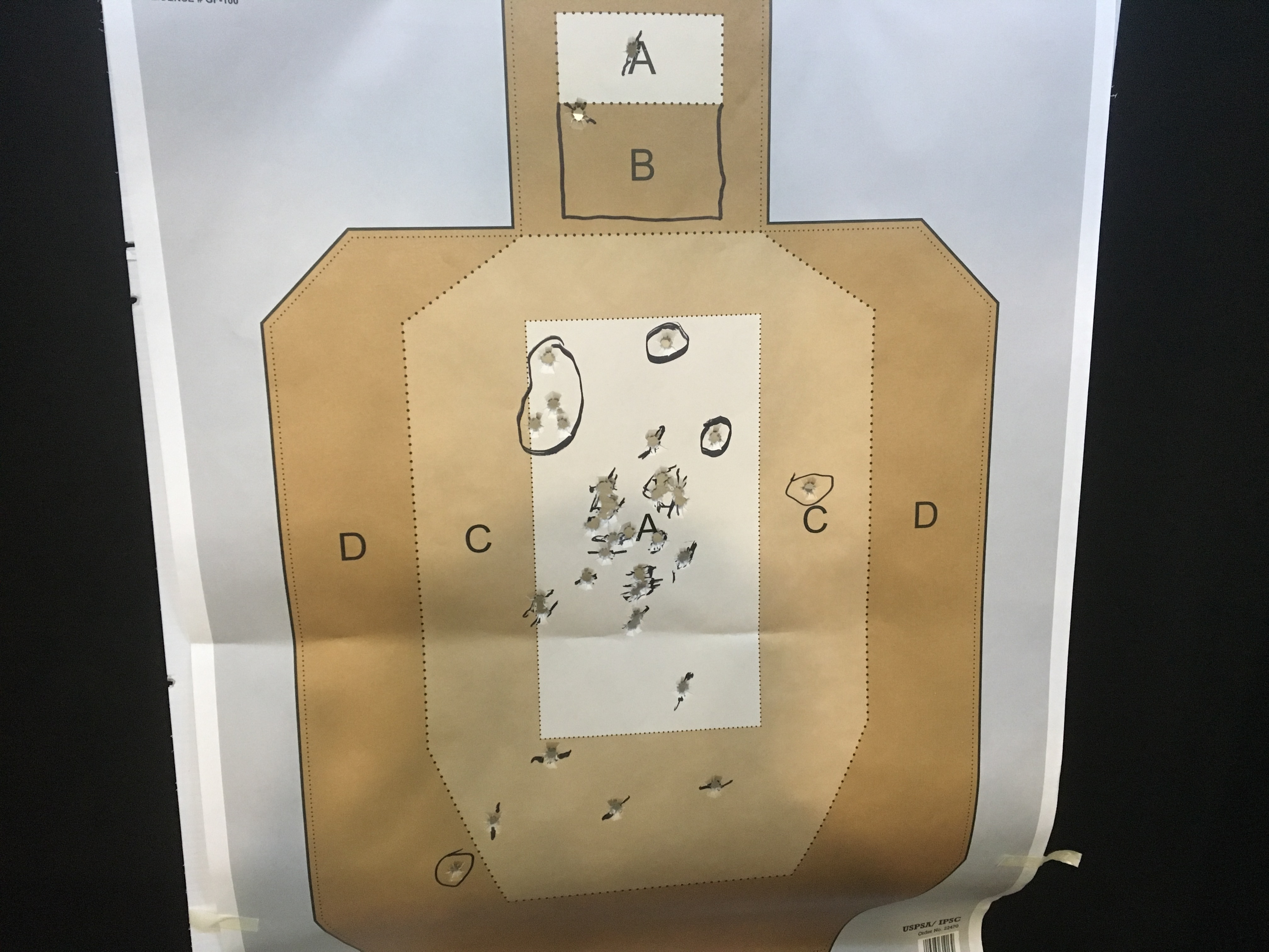 I used an IPSC Silhouette and an adjusted head box to score. The Box would be 10, outside the box would be 4 to match the CPP metric. On the body A would be 10. Within an inch of A bottom, left, or right would be 8. The remainder of C outside that inch would be 6. D would score 4. The timer application I used was IA’s Shot Timer. The app could not consistently pick up shots indoors but the par time function was all I needed.
