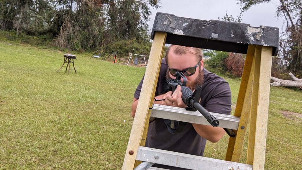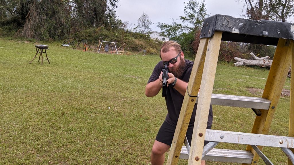 If you’re like me, you follow lots of reputable firearm instructors, schools, and competition shooters on social media. It’s one of the best ways to curate your social media and get something out of it. If you follow high-level shooters on social media, they often share tidbits of valuable information. It can be firearm-based, gear-based, or training-based. An excellent follow on Facebook is Sentinel Concepts. One of his latest posts showed him using a ladder with a simple comment that ladders are a simple range item that offers a lot of options.