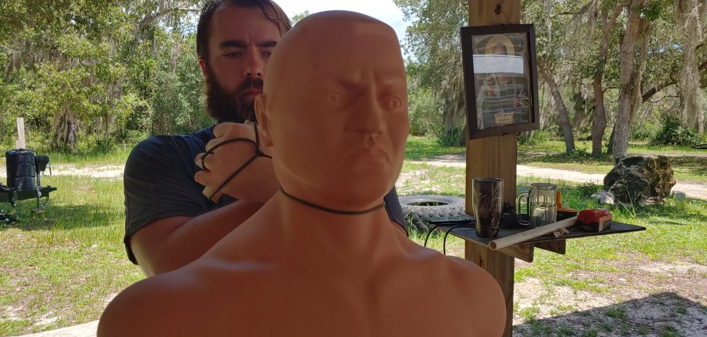 Personally, the front choke with a garrote looks like a pain in the ass, and I’d likely just revert to punching, kicking, and biting rather than attempting a front choke.