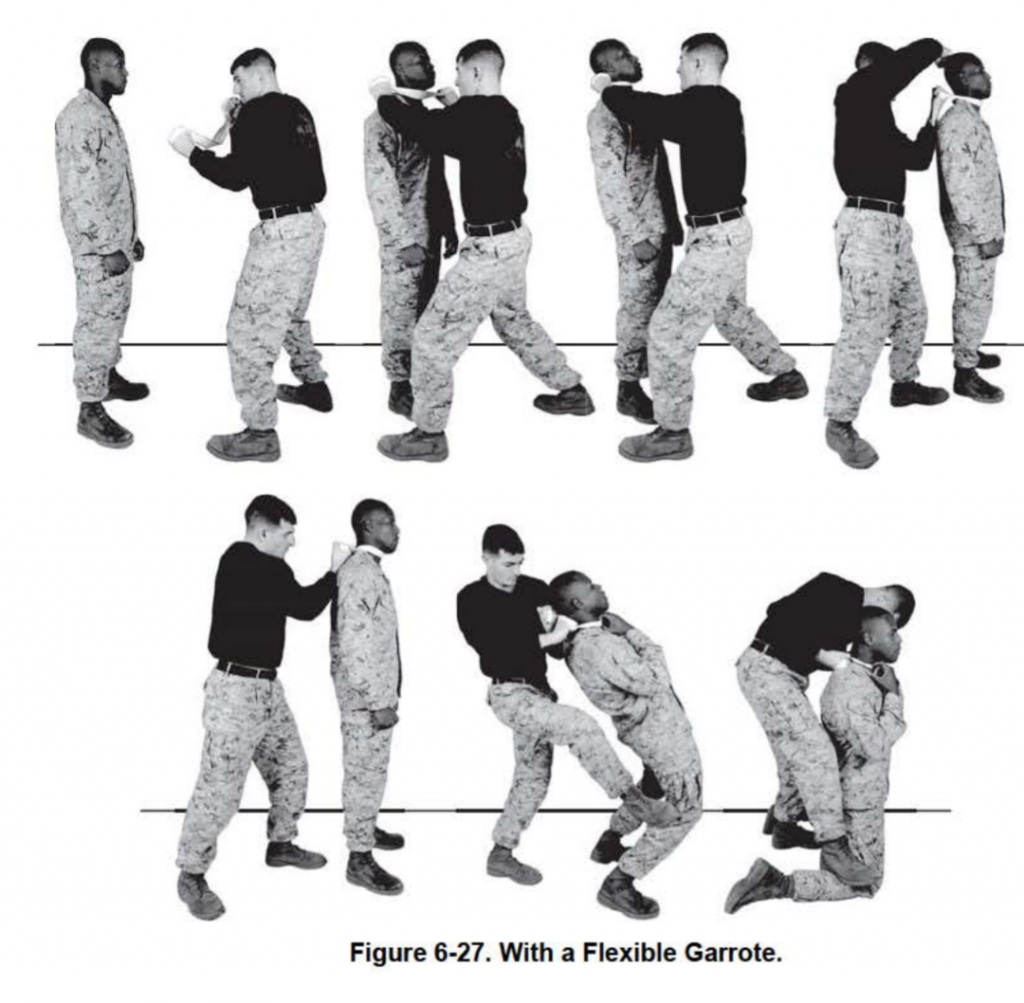 Is removing a sentry with a garrote more effective than using a suppressed rifle with subsonic rounds? Hardly, but it’s fascinating to know it’s still something the Marine Corps keeps in their back pocket just in case. High tech vs. low tech. Check it out, the USMC MCMAP manual can be easily found online if you want to see the other techniques Marine ninjas use.