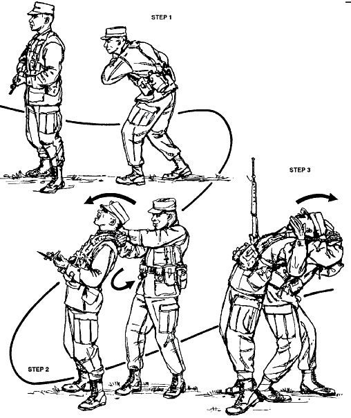 • Next, you will move around your aggressor’s right side to his back while simultaneously wrapping your right arm around the aggressor’s head so that the garrote ends up around the aggressor’s neck forming an X on the aggressor’s back. The right hand is palm side up, left hand is palm side down.