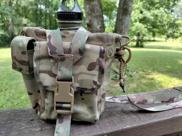 I worked with a fellow survival instructor who was the first person I noticed who made his own H20 kit. He used a canteen pouch and a cross-body strap length of cordage to carry his Nalgene-style bottle. He added a small pouch rigged to the case, some firestarters, and lots of duct tape.