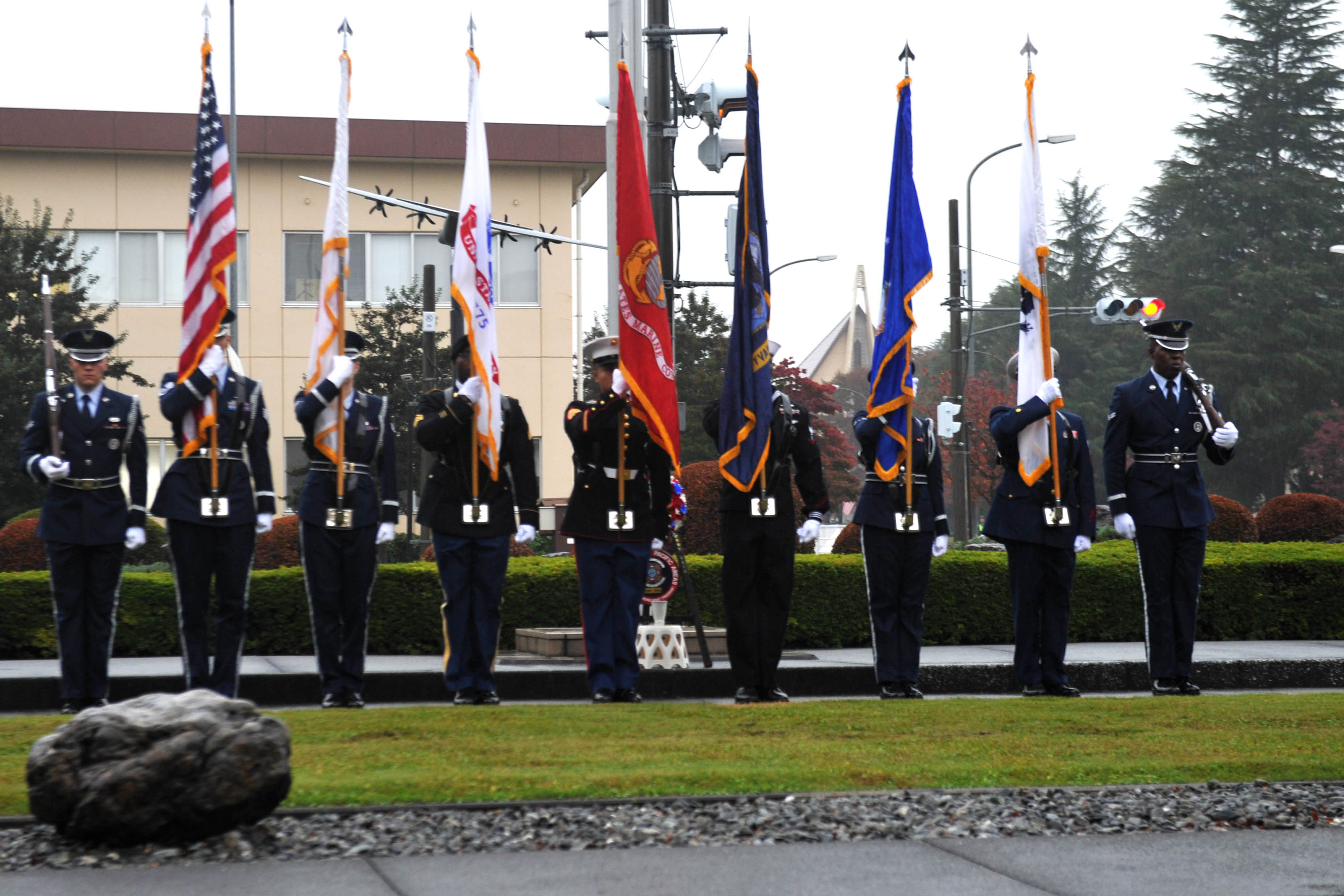 A Joint Service Color Guard opens the Veterans Day ceremony at Yokota Air Base, Japan, Nov. 9, 2018. This year marks the 100th anniversary of the observance when an armistice between Allied nations and Germany went into effect on the eleventh hour of the eleventh day of the eleventh month. (U.S. Air Force photo by Master Sgt. William P. Coleman)