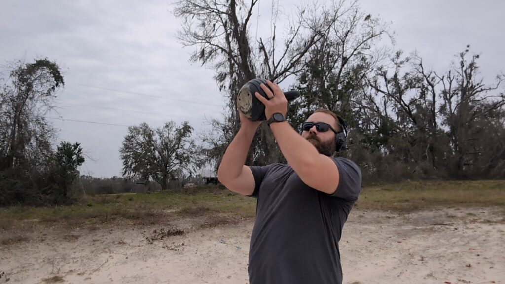 You’ll start the drill by doing some kind of physical work. Do what you prefer. I did kettlebell swings, overhead presses, and one-arm clean and presses. I went hard and fast to drive the heart rate high. While I’m currently overweight, I’ve been doing lots of cardio, and it takes way too much time to get my heart rate up. Also, working out in pants was a poor idea. Who makes tactical workout shorts?