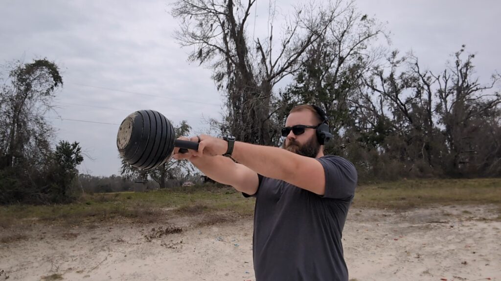 You need some way to get your heart rate up. Rick often uses a Brute Force Sandbag. I used a kettlebell, but if you can run sprints, do push-ups, burpees, or whatever, that will work, too. Our goal is to get our heart rate up. I aimed to hit 130 on my heart rate as measured by my smartwatch.