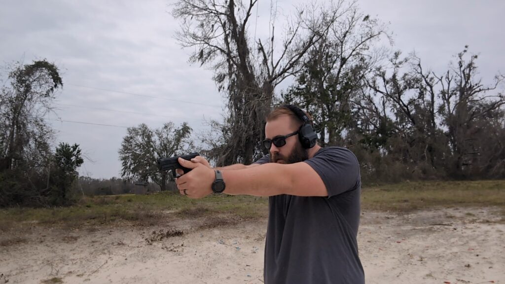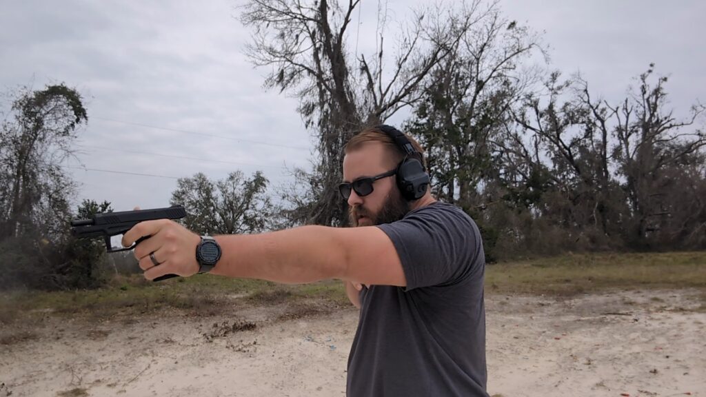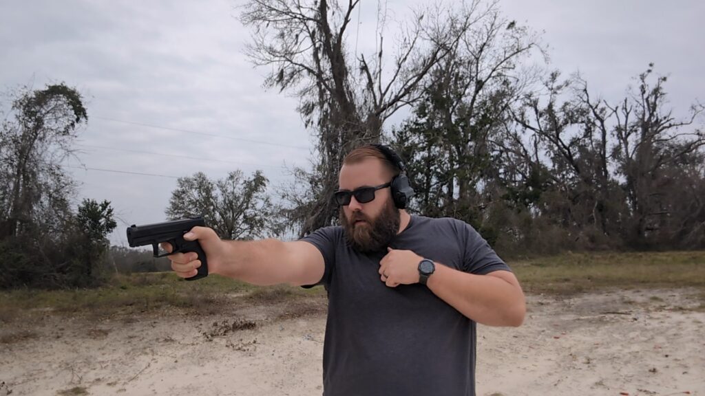 Once your heart gets to wherever you want it, you align yourself with the target and draw your firearm. The 1-1-1 Drill consists of one shot with two hands: one shot with your dominant hand and one shot with your support hand. It’s not complicated, but amping up your heart rate makes it a lot tougher.