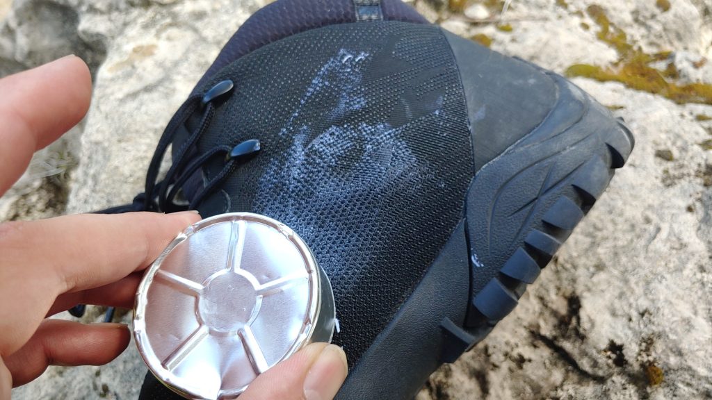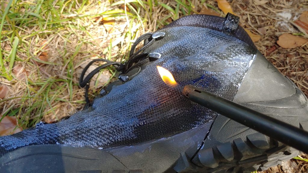 On top of that, it’s not exactly waterproof just yet. Next, you need to apply heat to the wax to melt it and allow it to really soak in, and this creates a nice waterproof layer. Waterproofers can use your campfire, a lighter, or a blow dryer to do this. You can tell the boots are waterproof once the white from the wax disappears. You know it’s nice and set in once the white disappears.