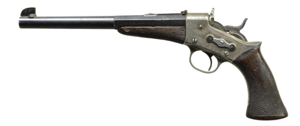 The Remington Rolling Block pistols were cartridge-based firearms, but as expected, they were only single-shot pistols. Revolvers of the era offered six shots, even if they were percussion cap pistols.