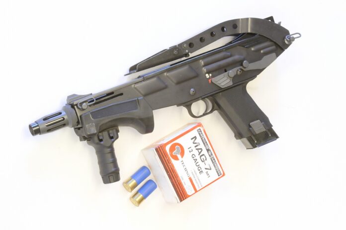 The shells were 60mm long, or approximately 2.36 inches overall. These short shells allowed for a reasonable grip, but they’re still way bigger than most people prefer. A five-round magazine in the grip makes the MAG-7 quite small in its original configuration. A top-folding stock kept the gun compact when necessary, and the 12.6-inch barrel kept things maneuverable.