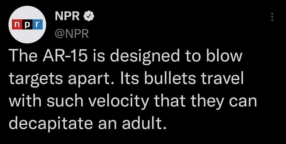 The part where she states that AR-15 rifle rounds travel at 3 times the speed of light. Now, admittedly, this could be an honest gaff and she meant sound, which is true roughly at 3,000 fps. But look at the NPR post now. Decapitation by an AR-15. Like this is either factual or a useful piece of information. If AR’s could decapitate there’d be a lot more headless corpses in the middle east.