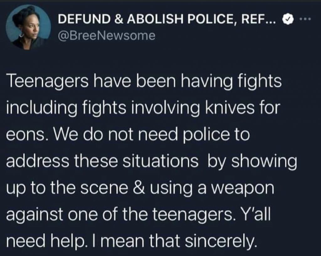 Ma’Khia Bryant was the individual who’s safety mattered the least in those 11 seconds. The girl in pink she was attempting to filet, the other individuals around the vehicle, and the officer who did not have any active support from other officers at the moment, were all higher priorities to keep safe than Bryant. The best option was the option the officer used. It was the only option that was likely to prevent the girl in pink from sprouting new bloody holes. Bryant was already moving, already stabbing, and already in physical contact with the other girl pinning her to the car.